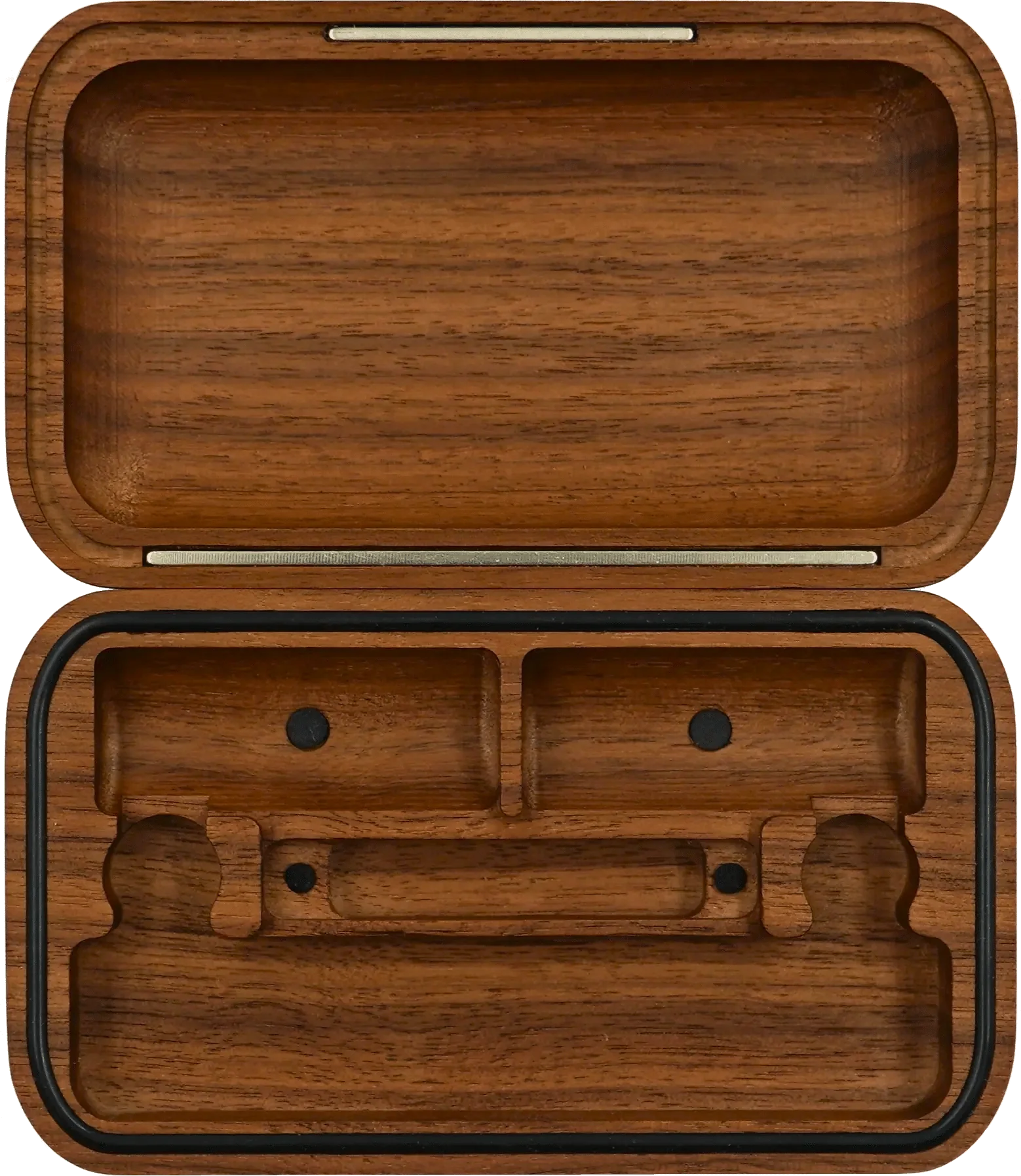 Handgefertigt aus edlem Nussbaumholz – das Rolletui® vereint geruchsdichte Aufbewahrung, clevere Magnet-Technologie und perfekt platzierte Fächer für alles, was du brauchst. Stylisch, kompakt und ready für unterwegs.