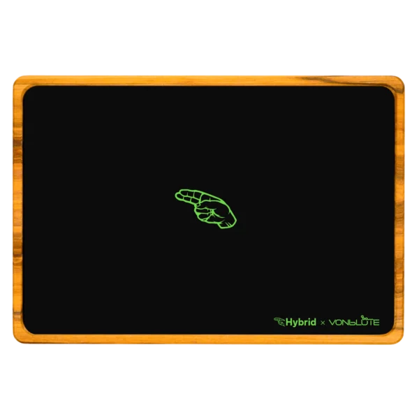 Wenn Hybrid und VONbLÜTE sich zusammentun, entsteht kein Accessoire – es entsteht ein Statement. Schwarzes Floatglas, tief und glänzend wie Asphalt bei Nacht. Ein Rahmen aus Satin Nussholz, veredelt mit Holzhaptik-Lack, made in Germany. In der Mitte das grüne Hybrid® Logo, unten rechts das Collab-Siegel. Ein Piece, das schreit: Hier geht es nicht um Durchschnitt. Hier geht es um Culture.