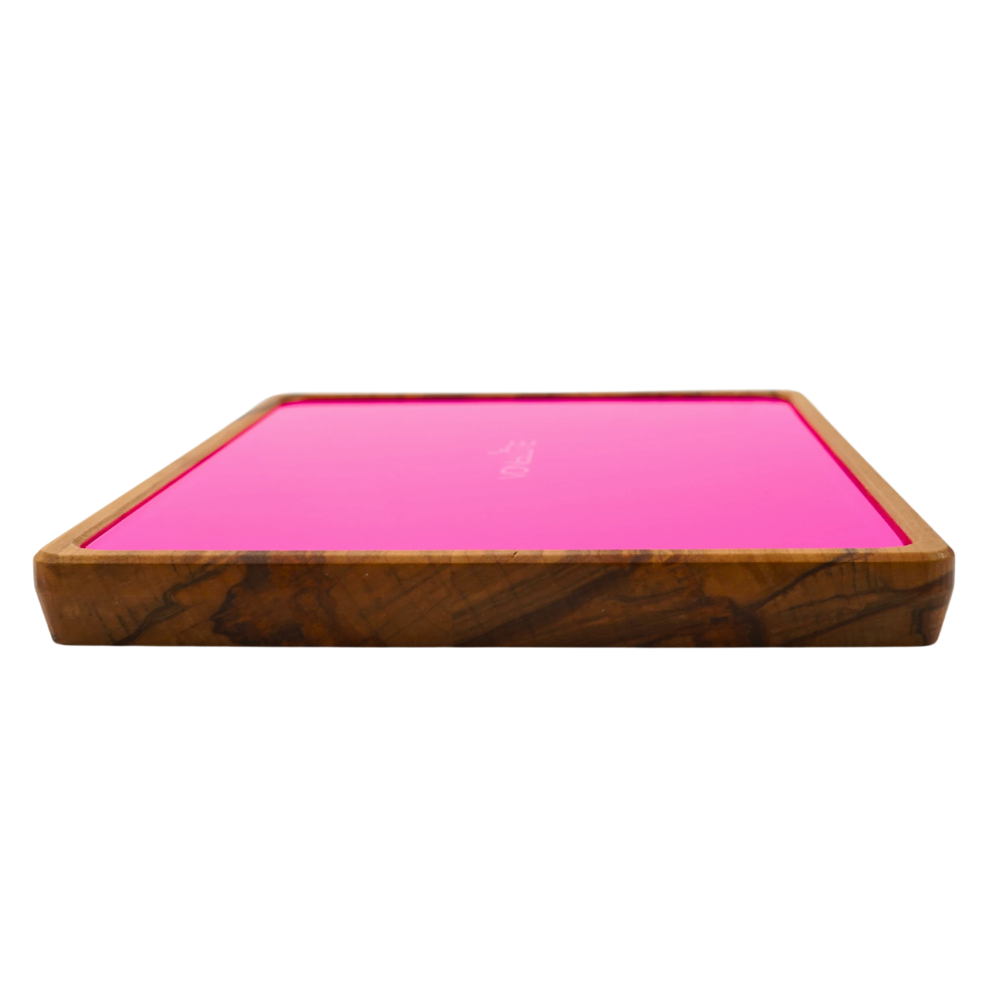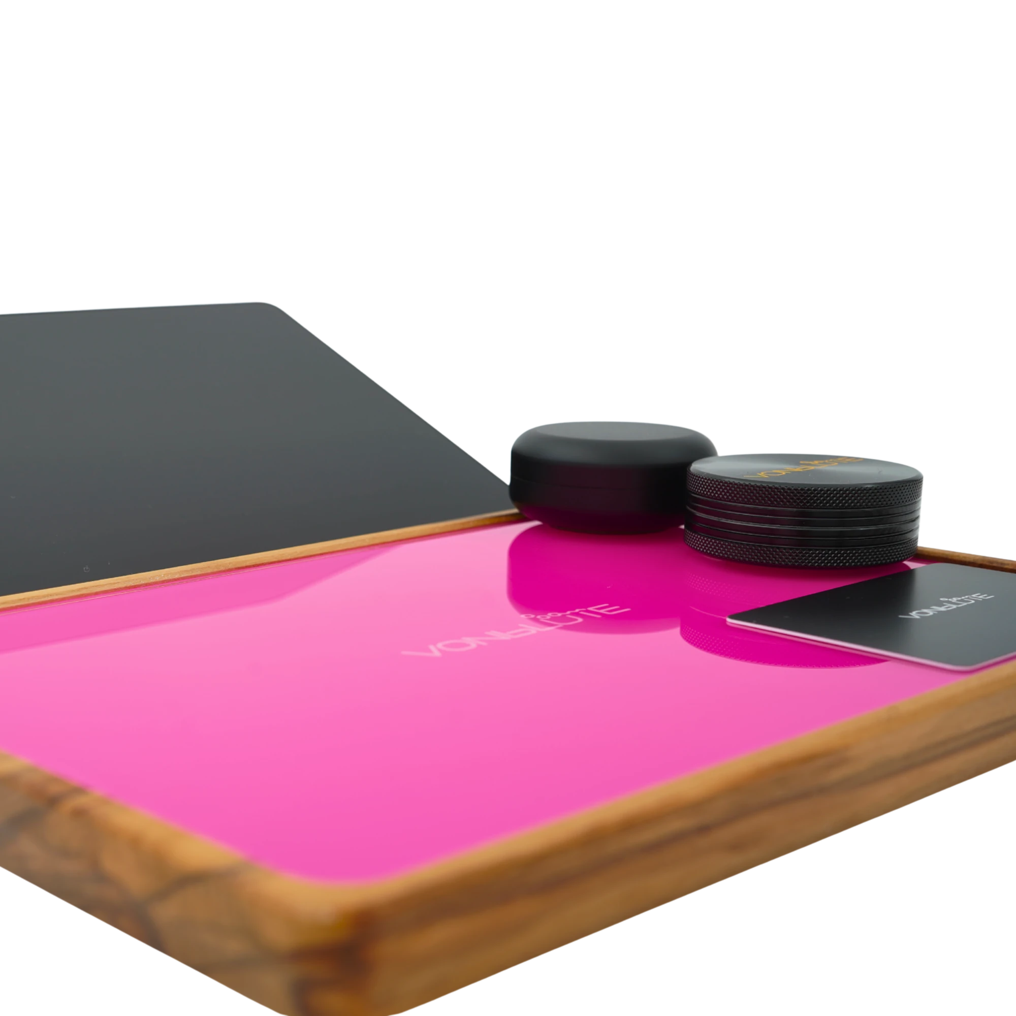 Die pinke Glasplatte liegt minimal versenkt im Holzrahmen aus Satin Nuss – Tiefenwirkung und Reflexion für den charakteristischen Floating-Effekt. Das 5 mm starke Floatglas in Knockout Pink bietet dir eine vibrierende Arbeitsfläche, auf der sich schwarzer Grinder und Storage wie grafische Elemente abheben. Transparente Silikonpads halten dein Zubehör erhöht über der Glasfläche – präzise positioniert, optisch markant und absolut kratzerfrei.
