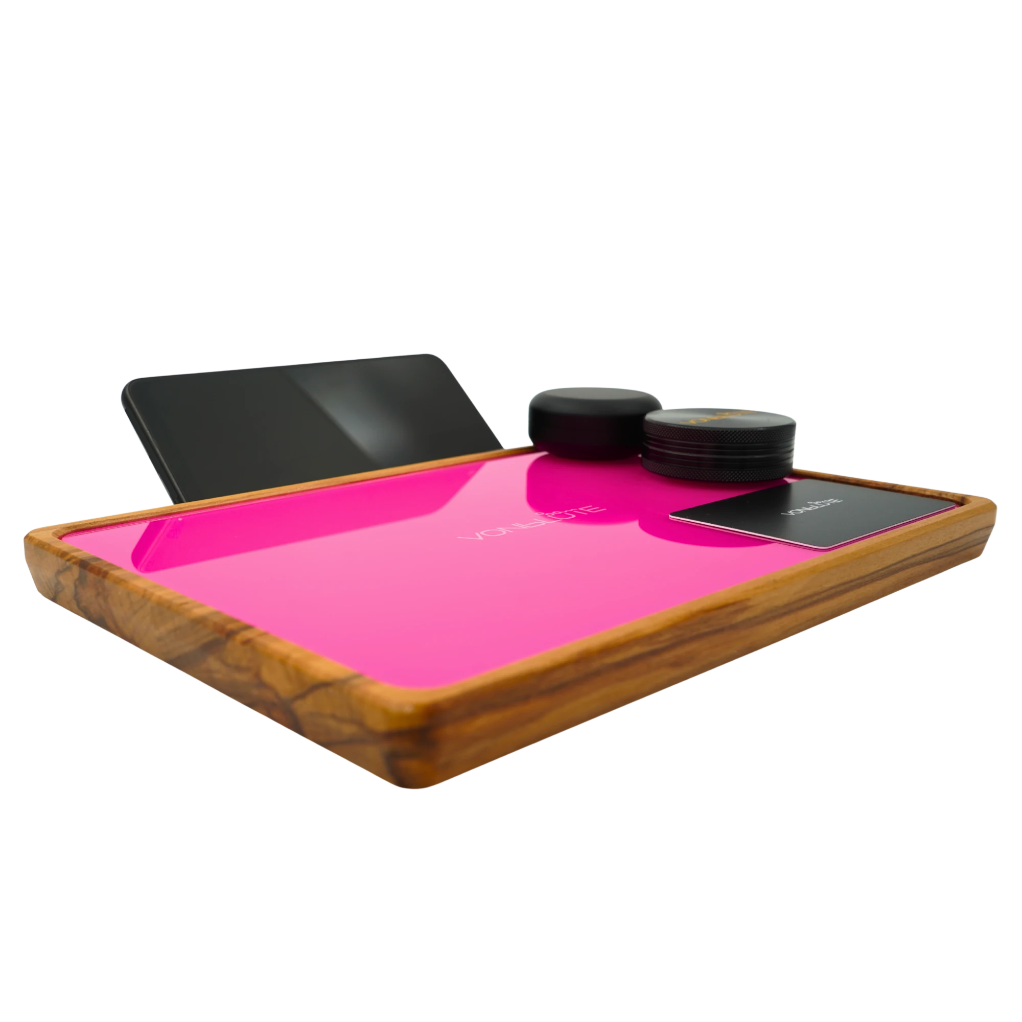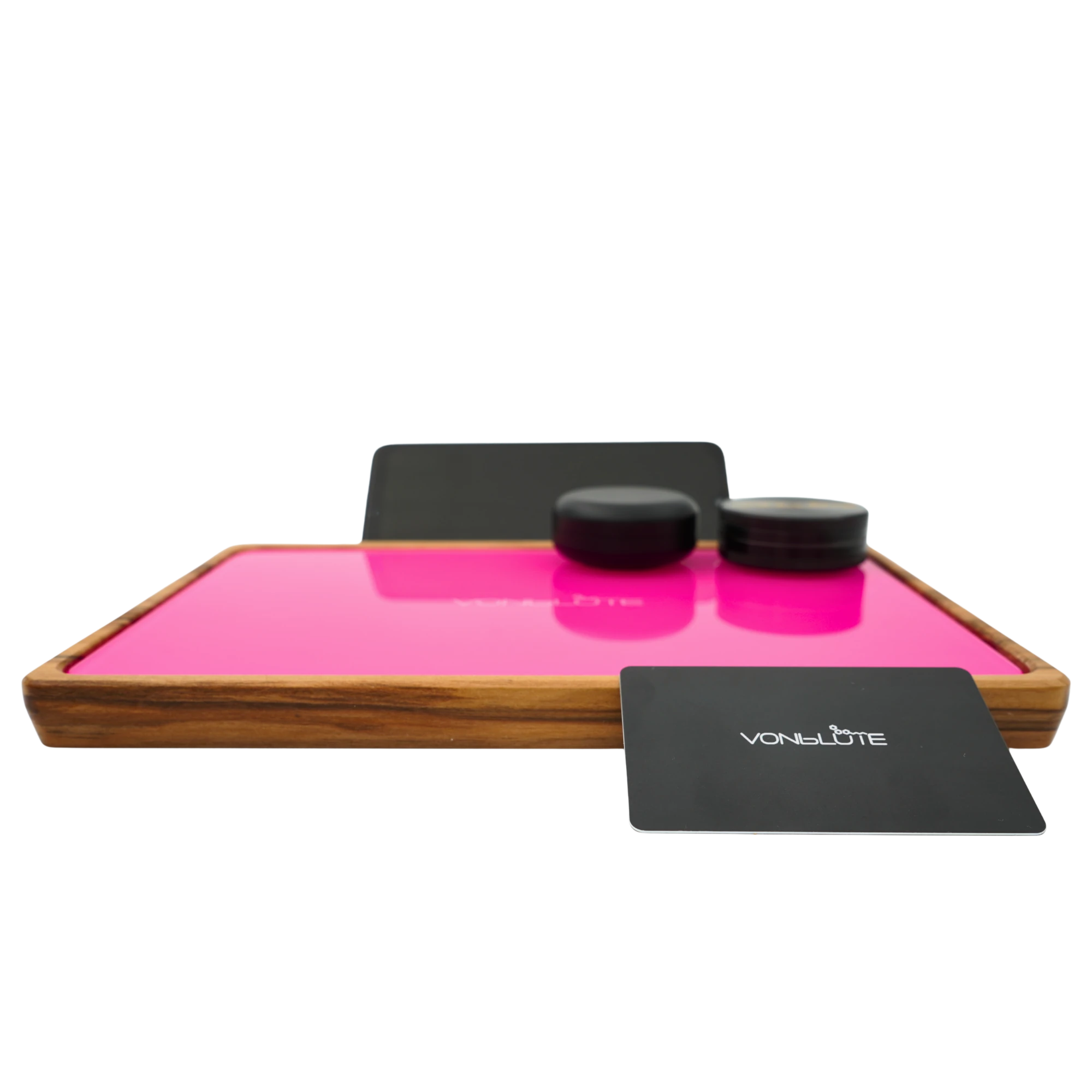 Das Rolling Tray Float Knockout Pink Edition Black by VONbLÜTE® ist dein Statement-Tray für selbstbewusste Sessions – handgefertigt aus pinkem Floatglas und satiniertem Nussbaum. Kräftige Glasfläche trifft auf schwarzes Zubehör: ein durchdachtes Floating Holz & Glas Rolling Tray Set, das durch maximalen Kontrast lebt und Style zeigt. Für Menschen, die Farbe als Power-Statement setzen – ohne Kompromisse.