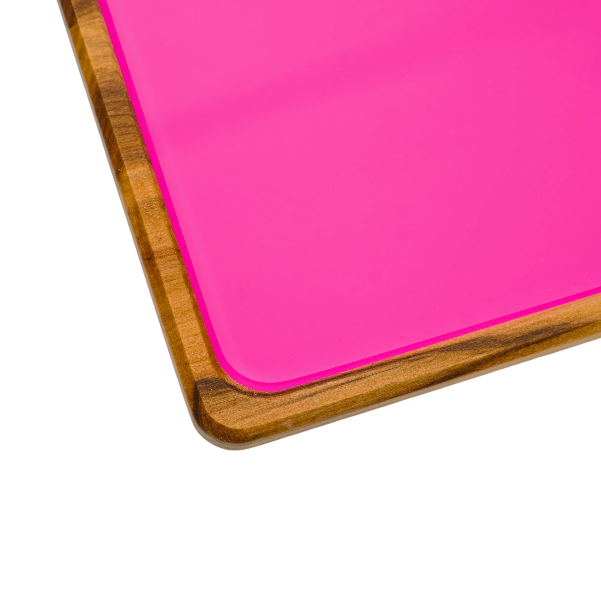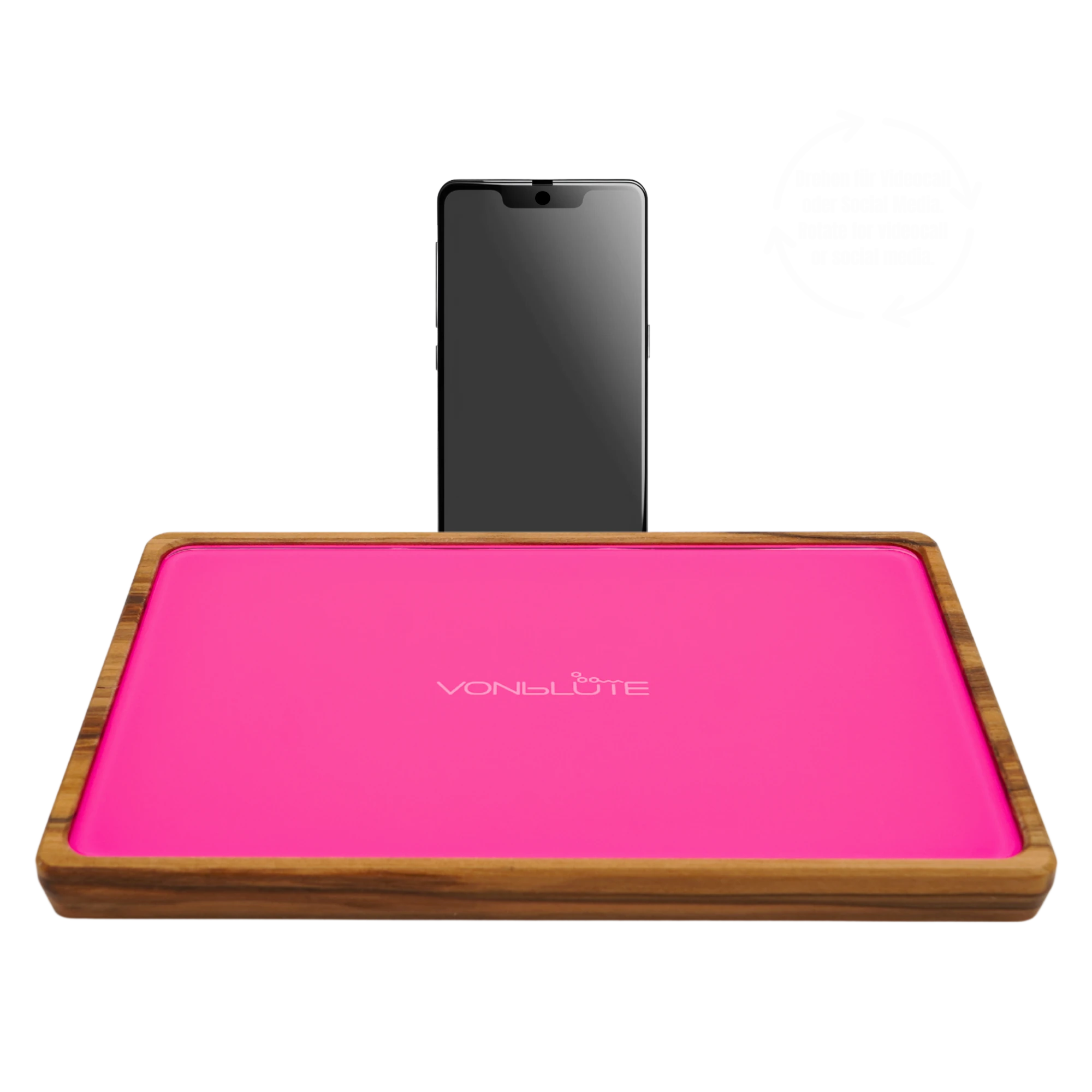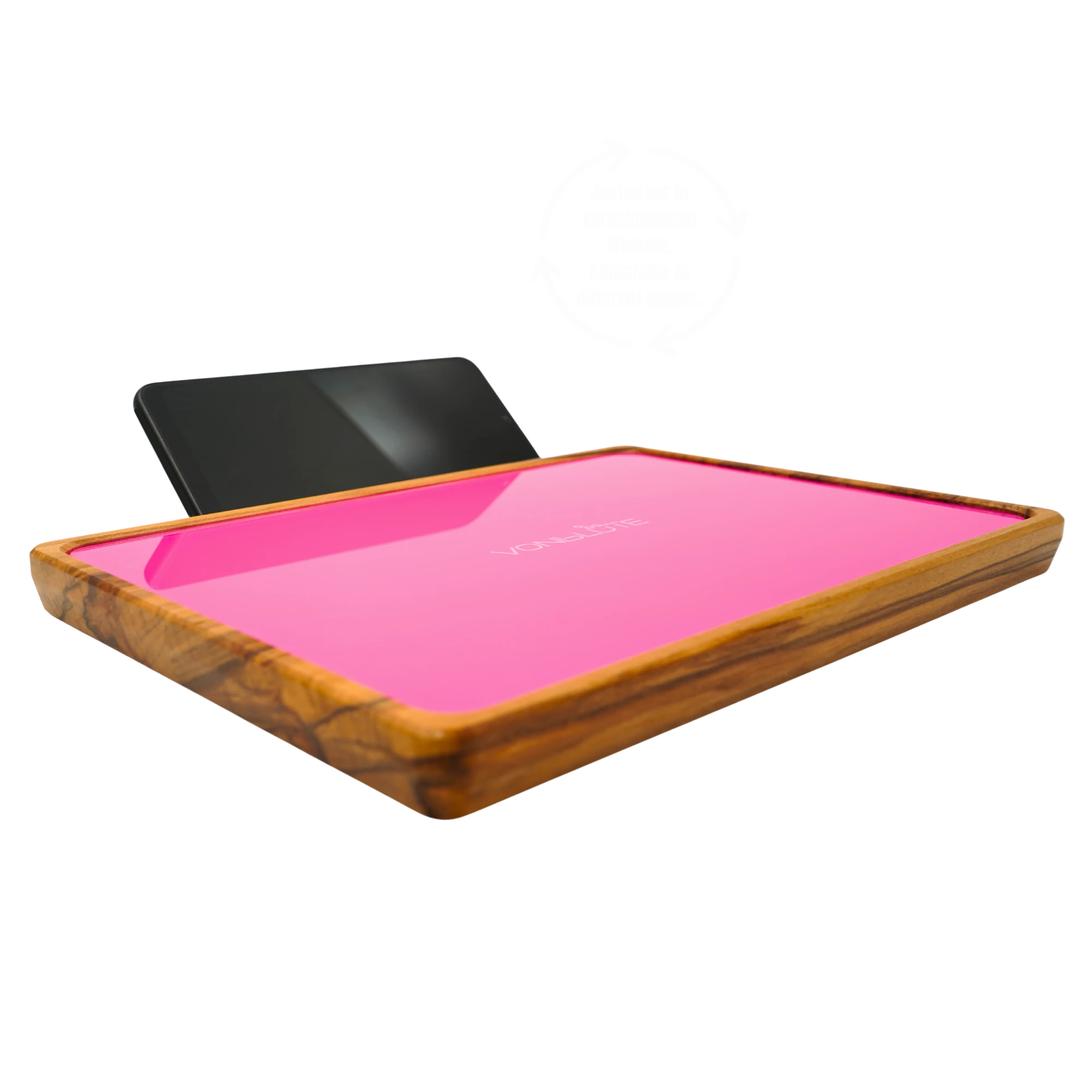 Dein edles Drehtablett aus Holz und pinkem Glas bringt Power ins Setup und hebt jedes Detail hervor.