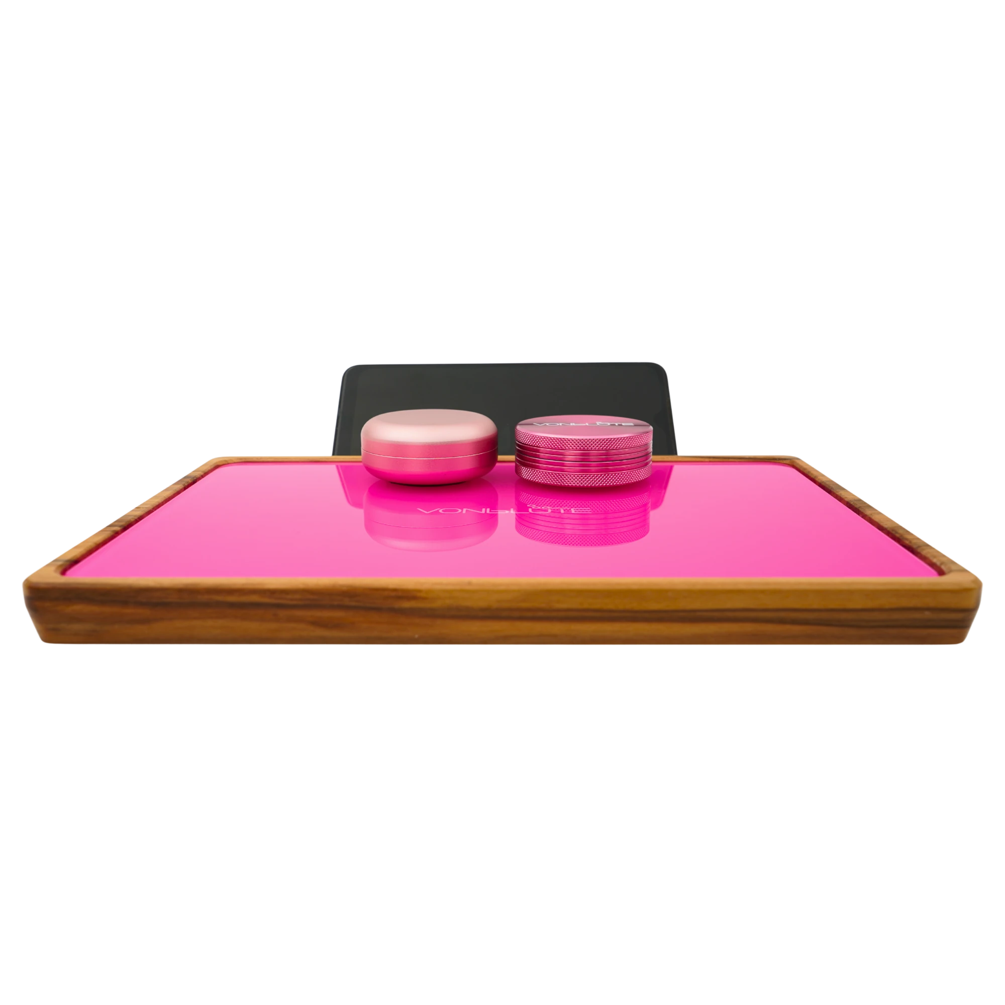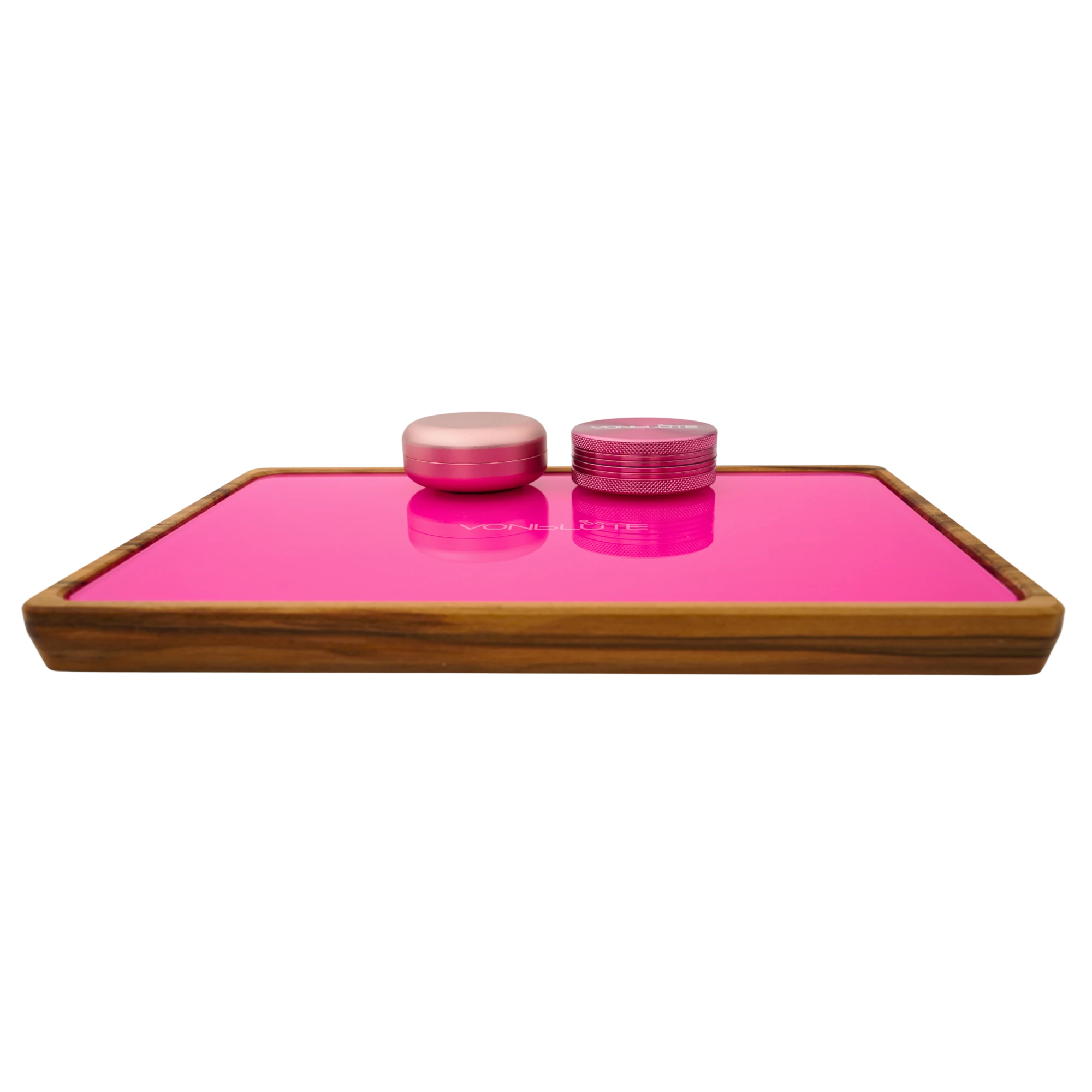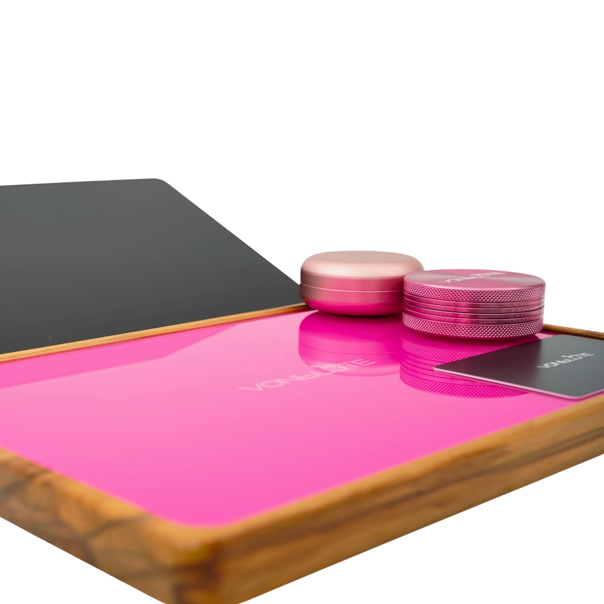 Die pinke Glasplatte liegt minimal versenkt im Rahmen aus Satin Nuss – für Spiegelung, Tiefe und den markanten Floating-Effekt, der dein Setup wie eine Installation wirken lässt. Transparente, runde Silikonpads halten Grinder und Storage sichtbar erhöht über der Glasfläche – vibrationsfrei, clean und funktional. Das Zusammenspiel aus Holz, Glas und Pink schafft einen Look, der selbstbewusst Räume prägt. Ein Rolling Tray komplett in Pink, das keine Kompromisse kennt.