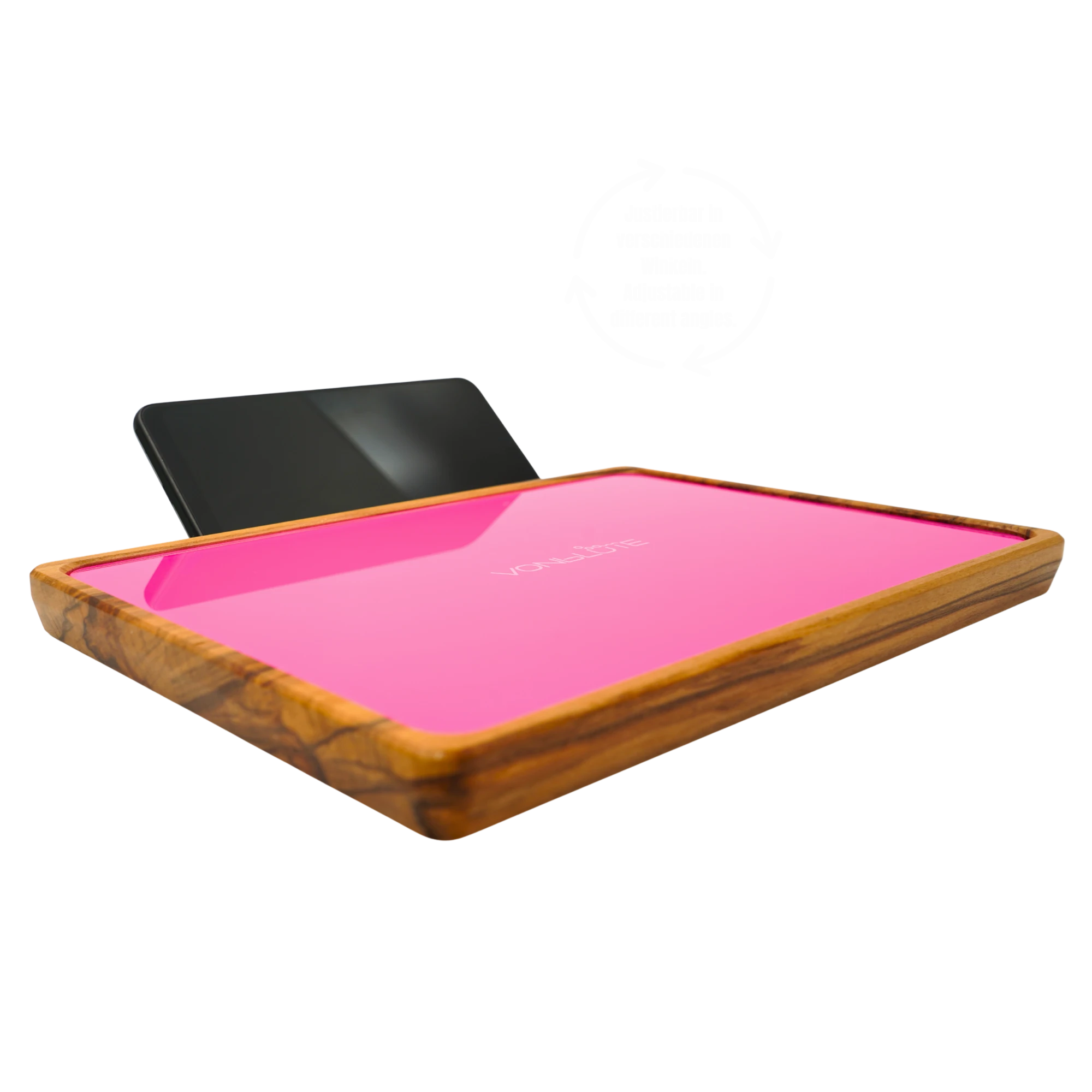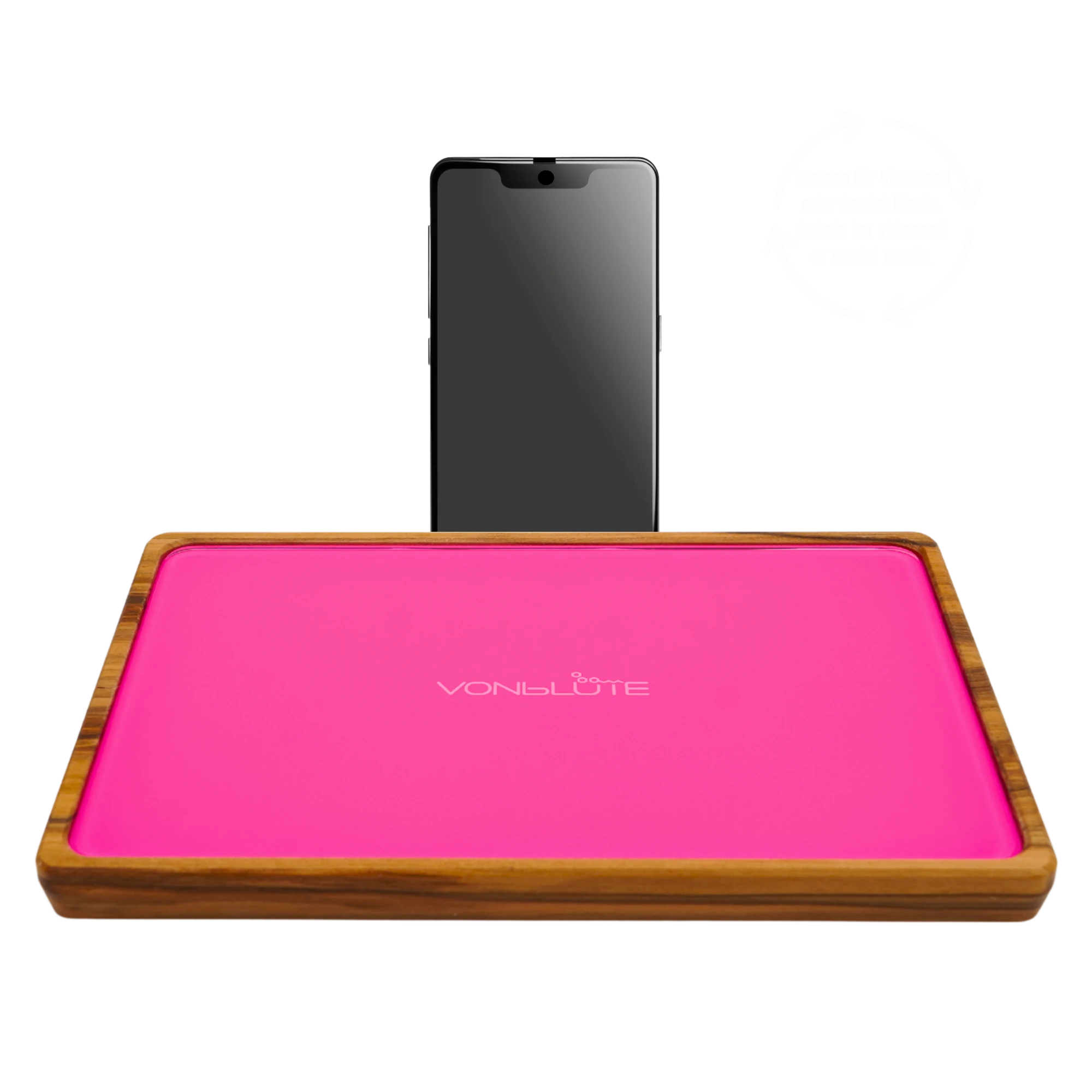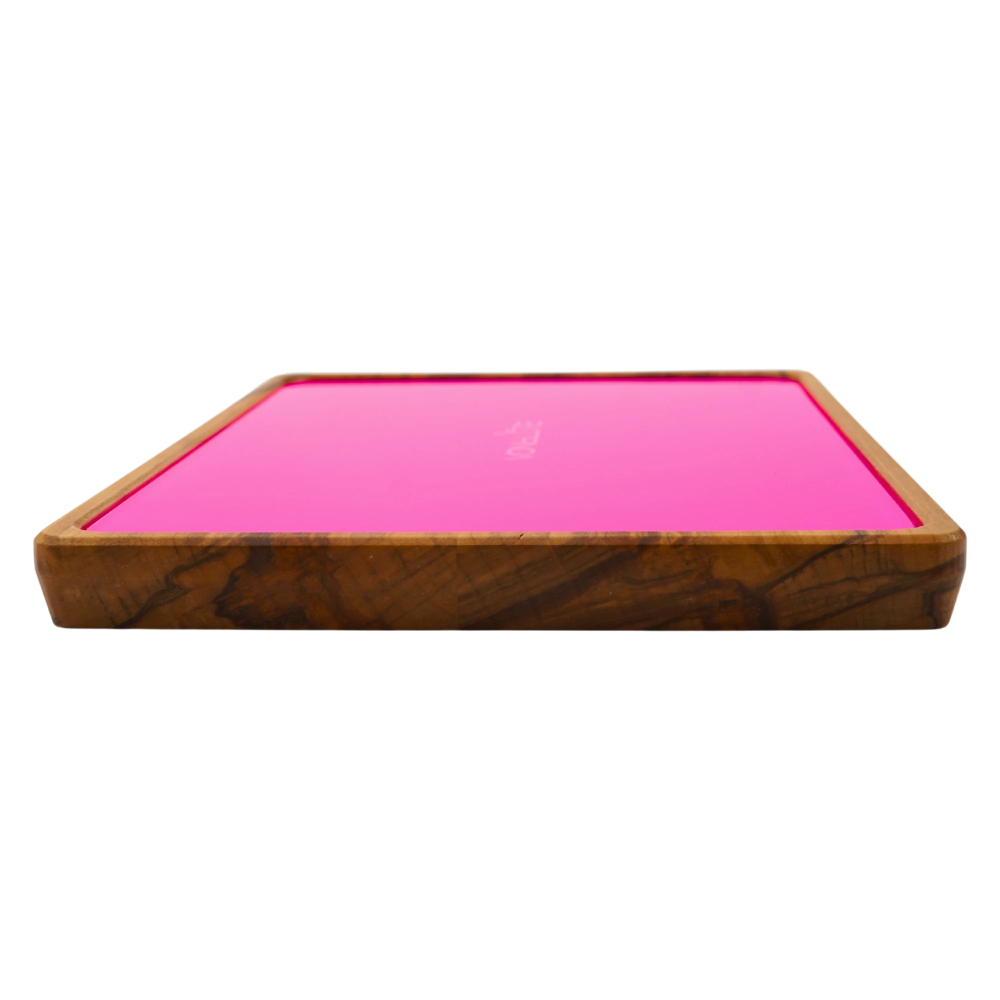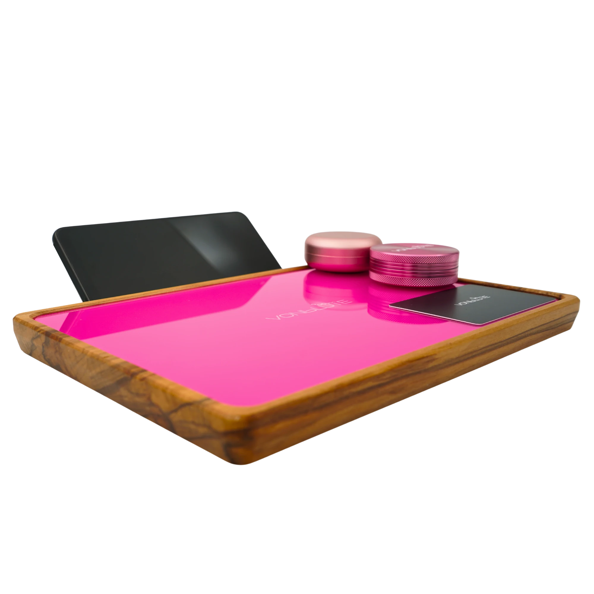 Die pinke Glasplatte liegt minimal versenkt im Rahmen aus Satin Nuss – für Spiegelung, Tiefe und den markanten Floating-Effekt, der dein Setup wie eine Installation wirken lässt. Transparente, runde Silikonpads halten Grinder und Storage sichtbar erhöht über der Glasfläche – vibrationsfrei, clean und funktional. Das Zusammenspiel aus Holz, Glas und Pink schafft einen Look, der selbstbewusst Räume prägt. Ein Rolling Tray komplett in Pink, das keine Kompromisse kennt.