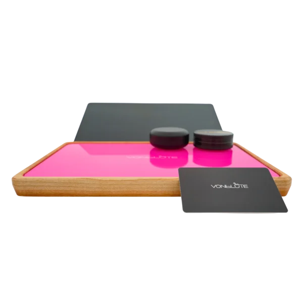 Der rötlich warme Holzrahmen setzt einen angenehmen Kontrast zur Pinken Mischfläche und verstärkt das Rolling Tray mit visueller Tiefe. Abends, wenn du dein Smartphone umdrehst, auf den Adapter auflegst und das Licht sanft auf die Glasfläche fällt, entsteht ein dezentes Leuchten, das den gesamten Look abrundet. Modern, präzise, wirkungsvoll – gefertigt in echter VONbLÜTE® Manufakturqualität.