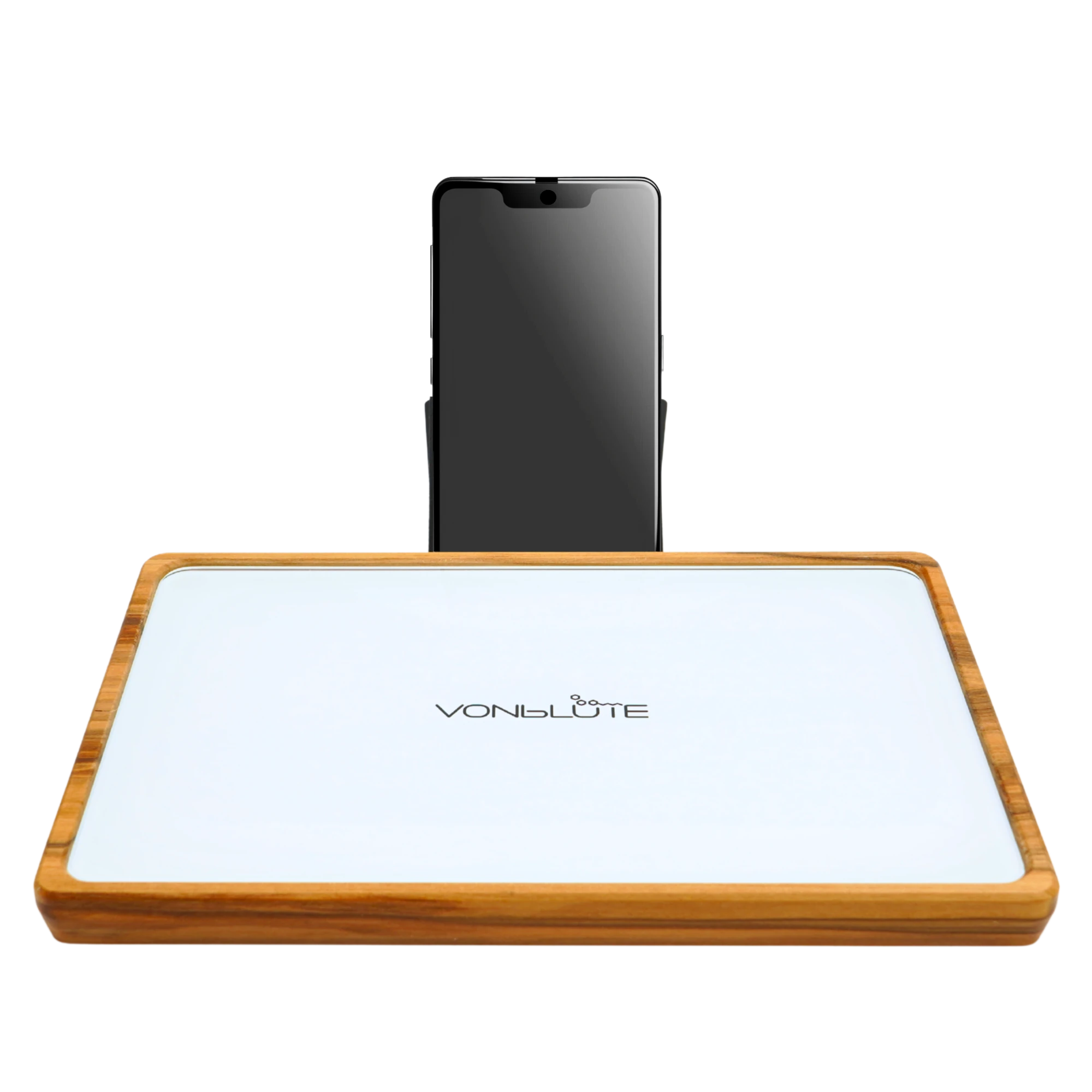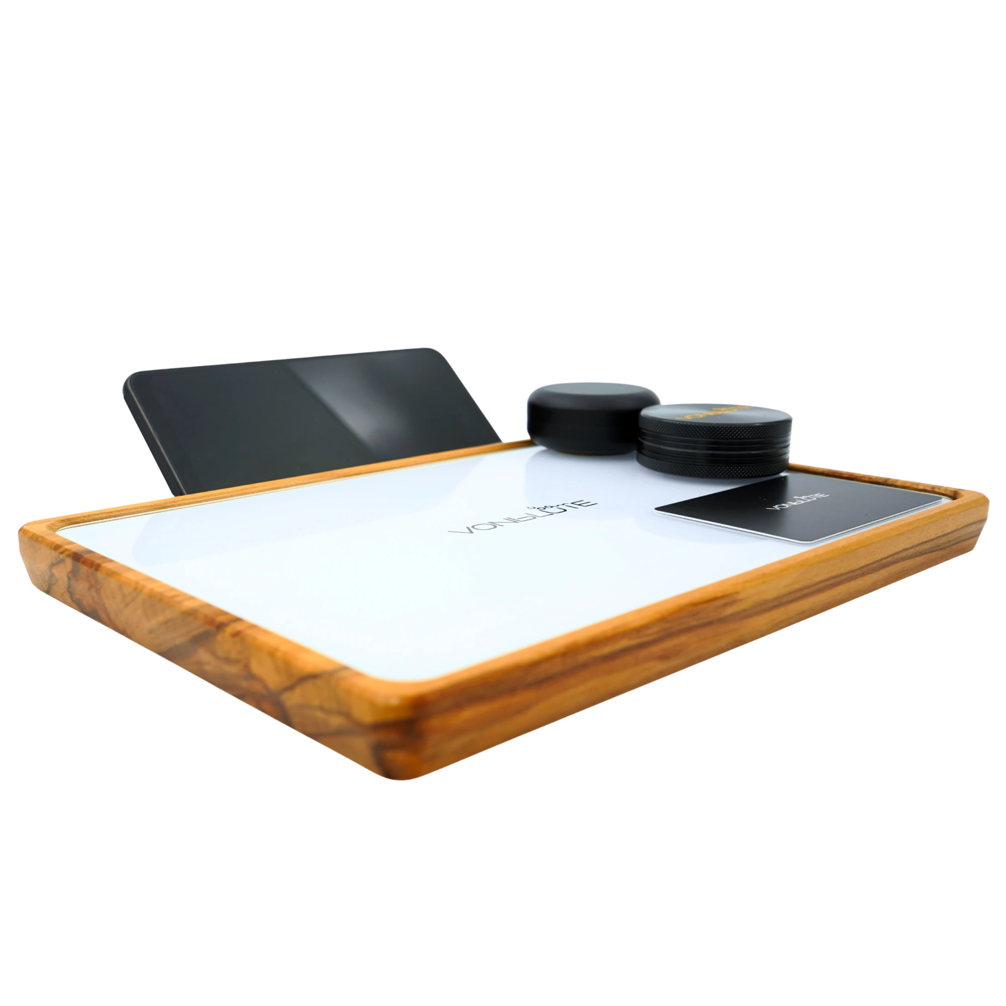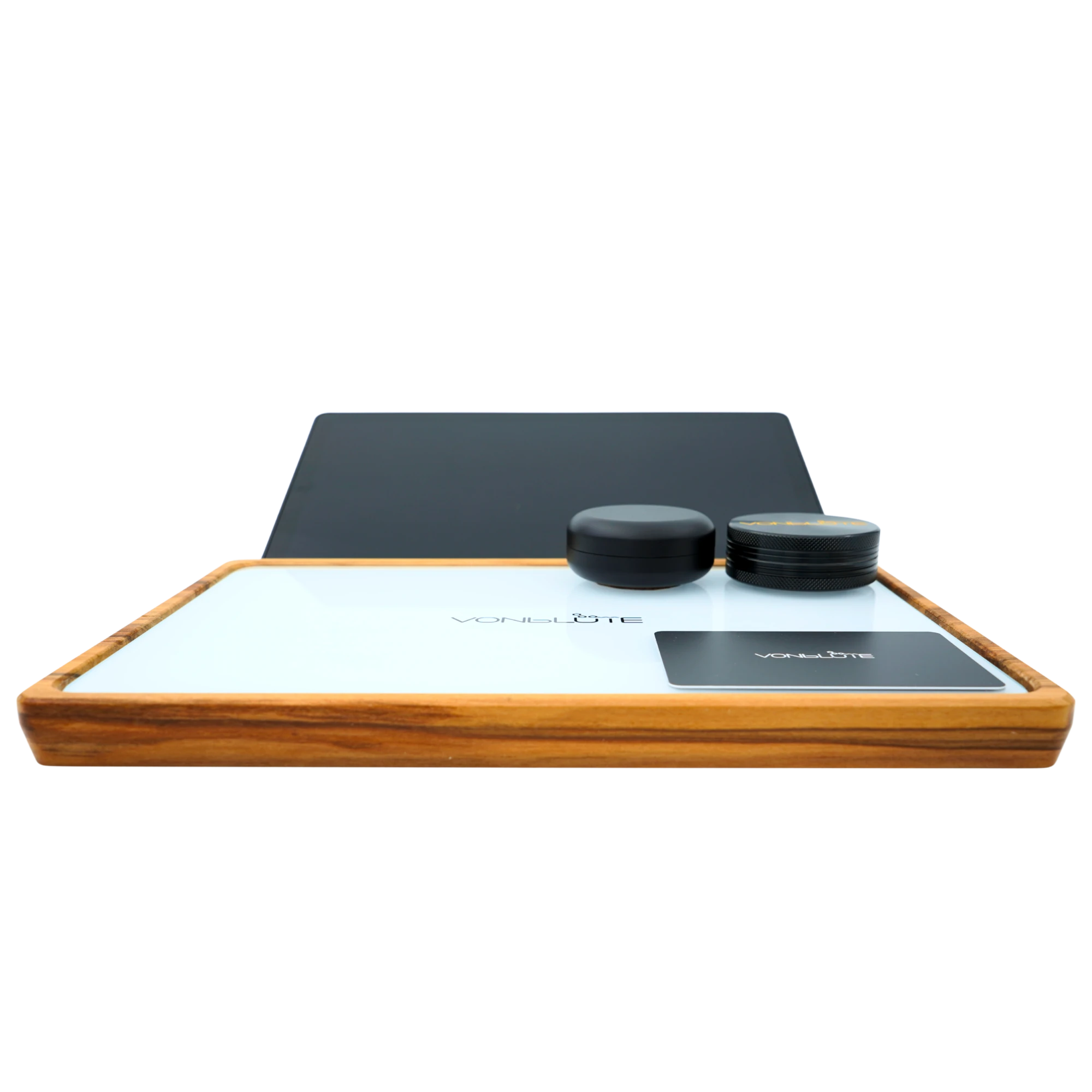 Transparente Silikonpads halten dein Zubehör erhöht über der Glasfläche – präzise positioniert und optisch elegant. Dies macht es zu einem Drehtablett aus Holz mit Grinder, das Kontrast zum Konzept macht. Der beiliegende Media-Adapter verwandelt dein Tray in einen praktischen Medienhalter für Smartphone oder Tablet. So kannst du Videos schauen, Musik hören oder Video Calls führen – alles im richtigen Winkel, während du drehst. Dies macht es zu einem Premium Rolling Tray Set, das Entertainment und Ritual verbindet. Die Glasfläche bleibt zudem entnehmbar: zum Reinigen, Austauschen oder für neue Color Drops – deine Drehunterlage mit weißer Glasplatte wächst so mit deinen Ideen.