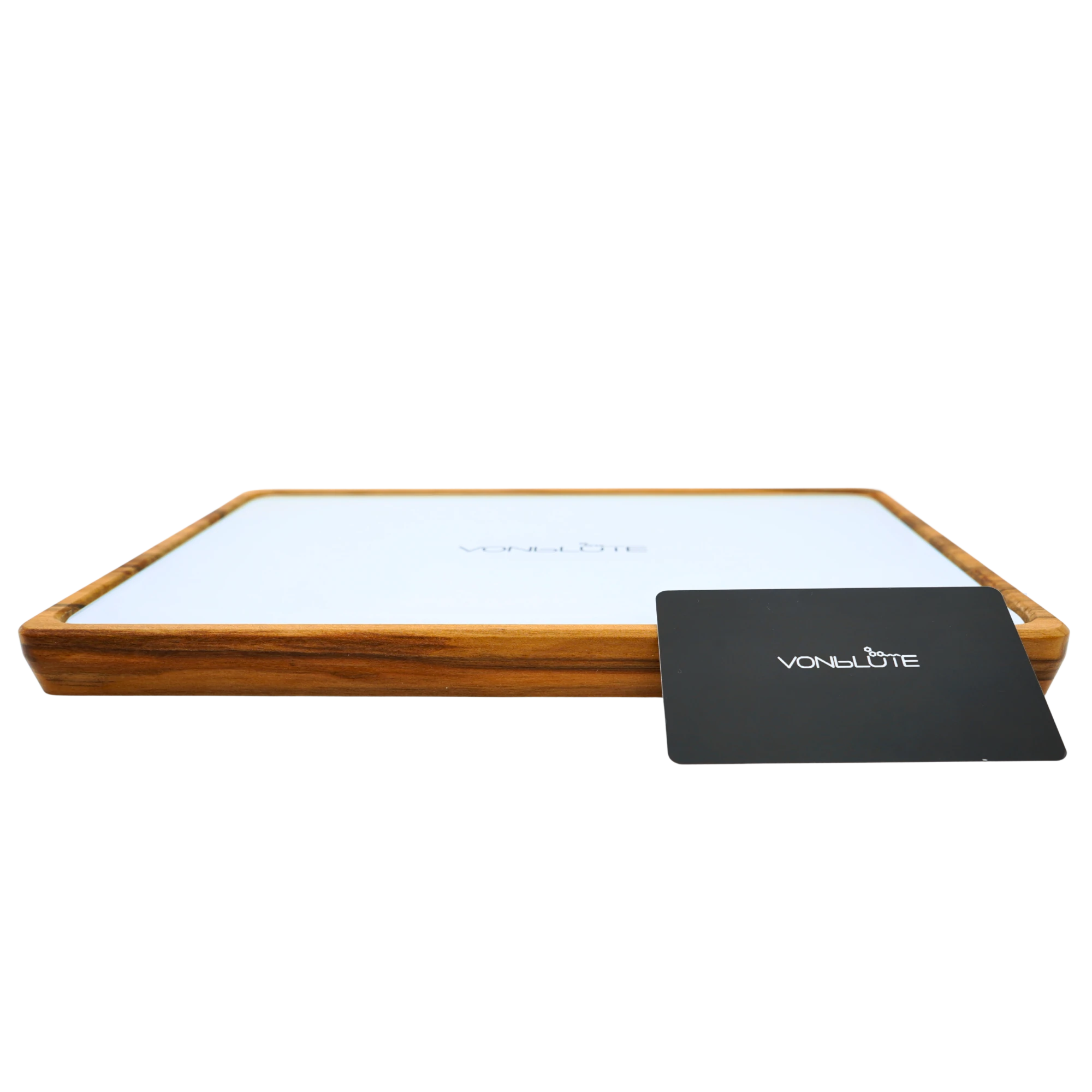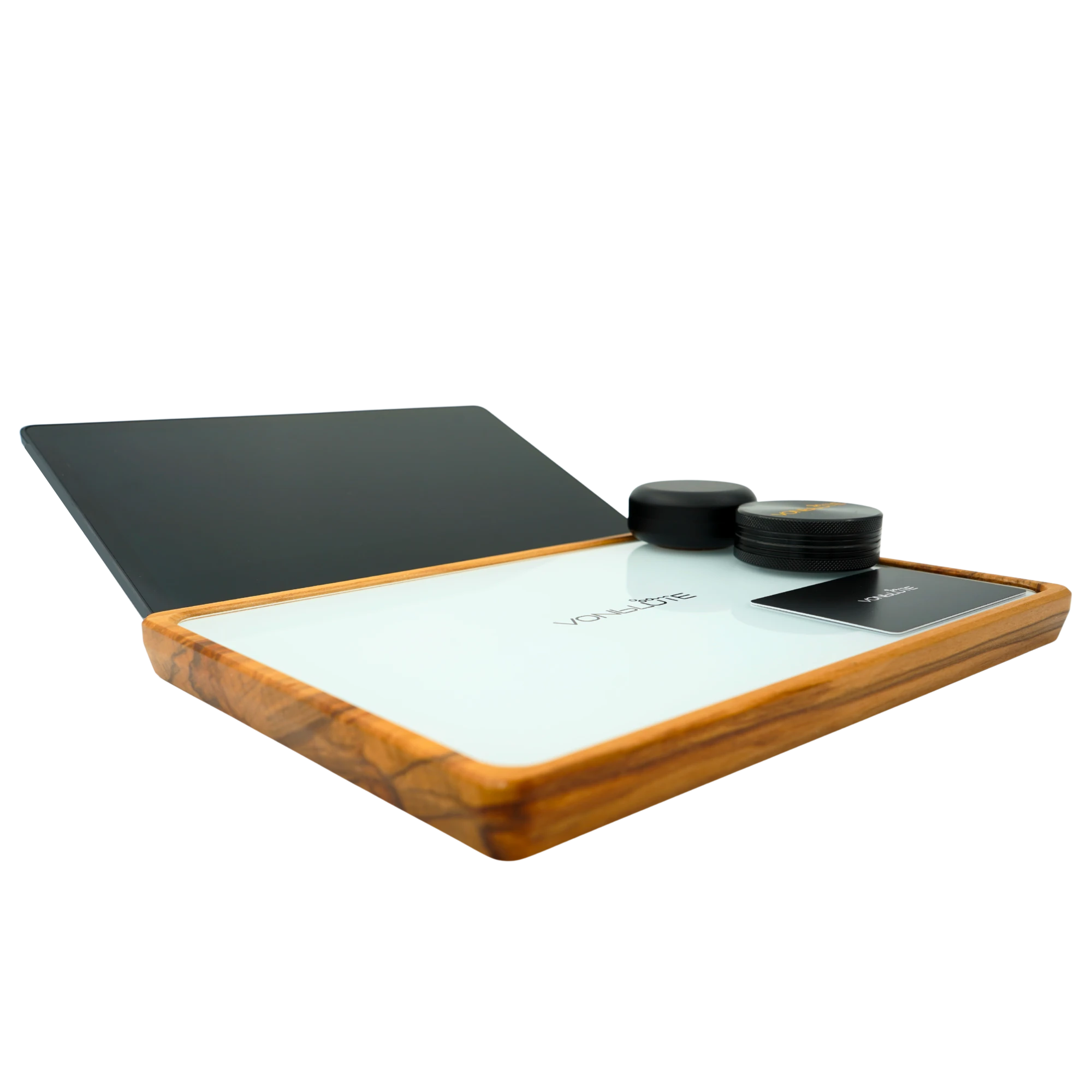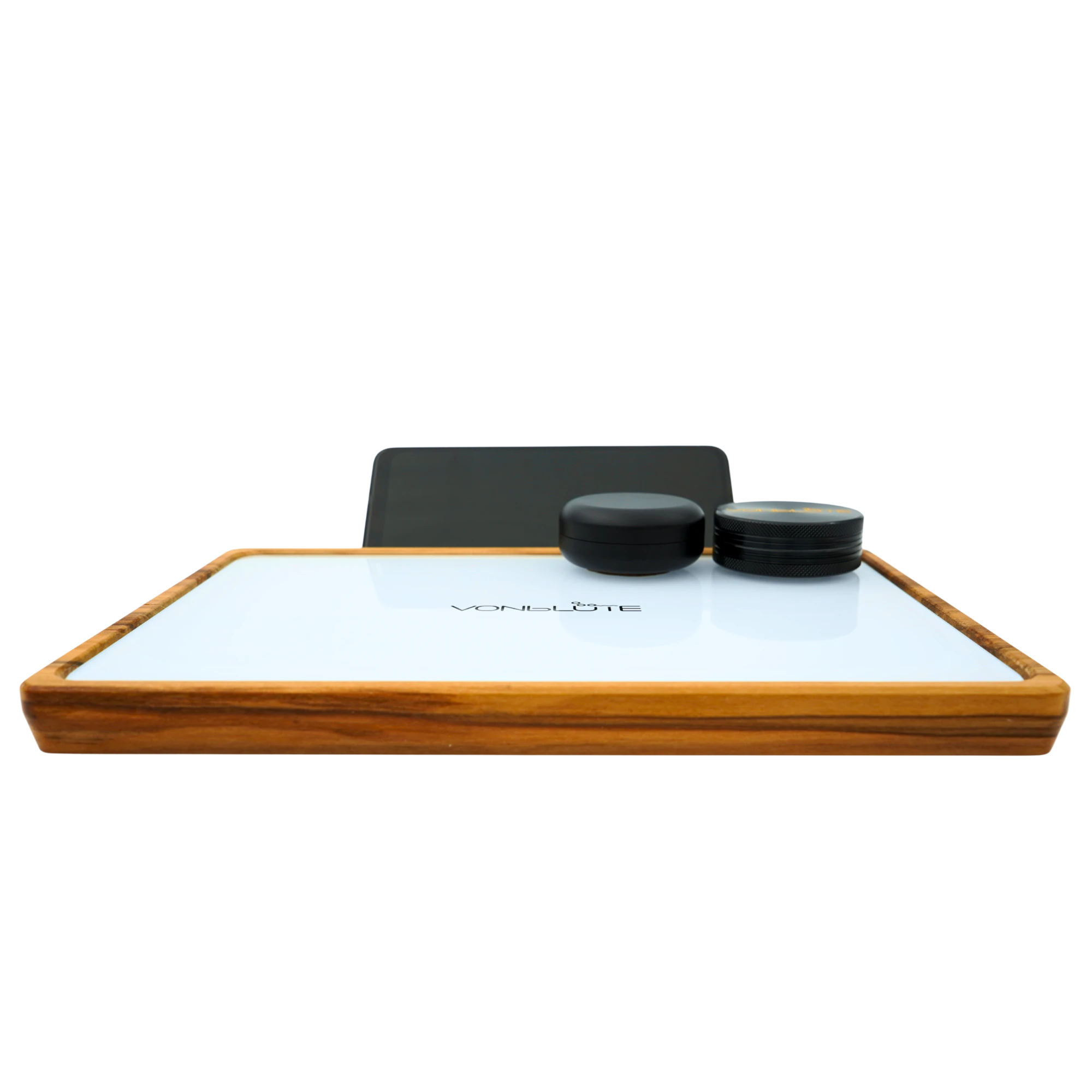 Das Rolling Tray Float Weiß Edition Black by VONbLÜTE® ist dein Drehtablett für reduzierte Sessions – handgefertigt aus weißem Floatglas und satiniertem Nussbaum. Es ist ein durchdachtes Floating Holz & Glas Rolling Tray Set, das durch Kontrast beruhigt und Details hervorhebt, indem helle Glasfläche auf schwarzes Zubehör trifft. Für Menschen, die Klarheit mit Funktion verbinden – ohne Kompromisse. Die weiße Glasplatte liegt minimal versenkt im Holzrahmen, was Schutz, Reflexion und den typischen Floating-Effekt bietet. Das 5 mm starke Floatglas stellt dir eine makellose Arbeitsfläche zur Verfügung, auf der sich der schwarze Grinder und Storage wie Akzente abheben.