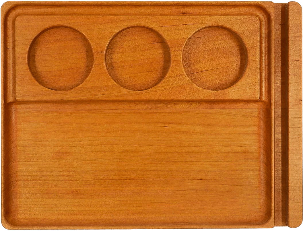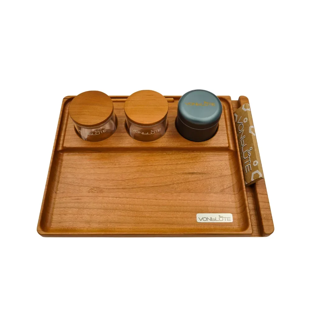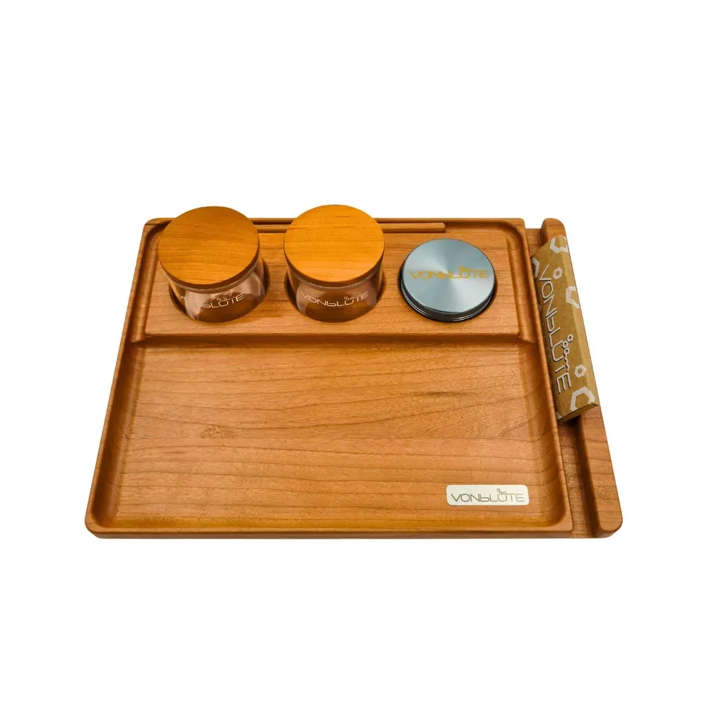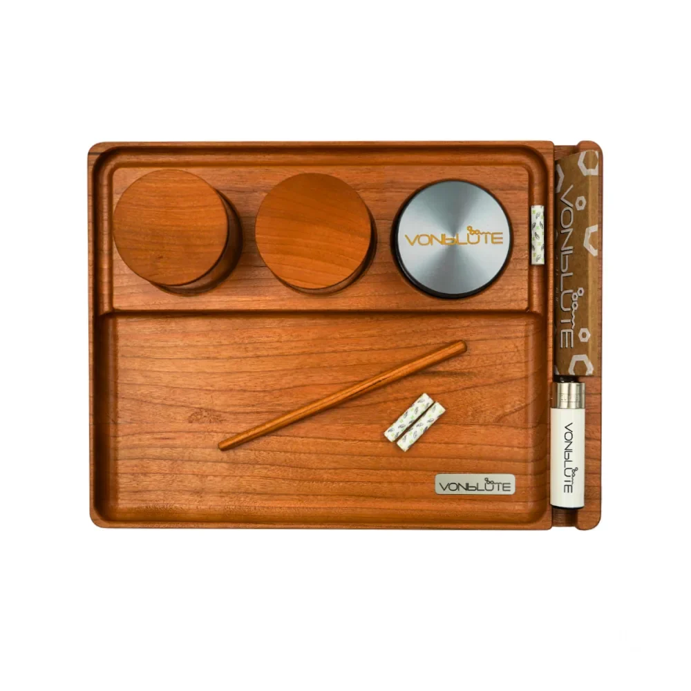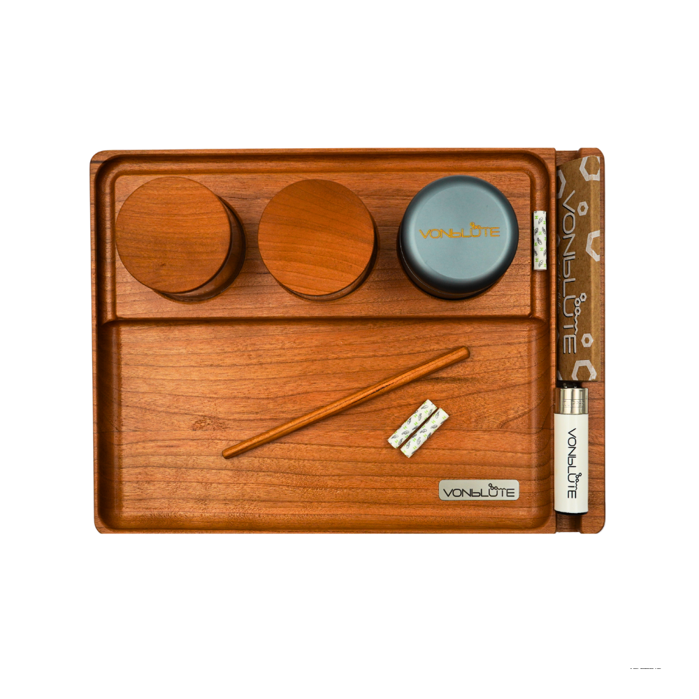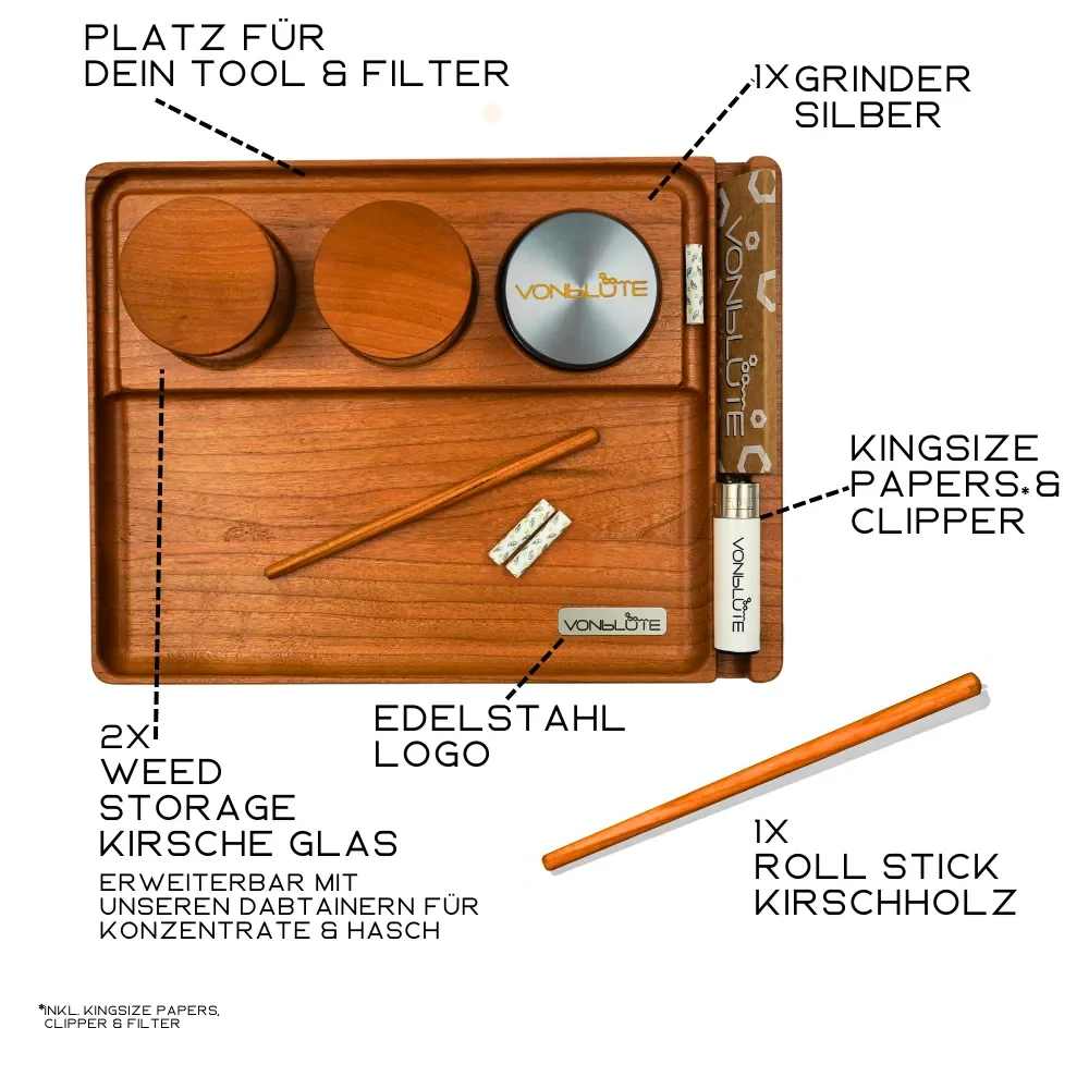 Ein Rolling Tray, das Design und Funktion vereint. Handgefertigt aus hochwertigem Kirsch- oder Nussbaumholz, mit präzisen Ablagen für Papers, Filter, diversen Aufbewahrungsbehältern & Grinder. Perfekte Ergonomie für ein stilvolles Rolling-Erlebnis – reduziert auf das Wesentliche, veredelt für höchste Qualität.
